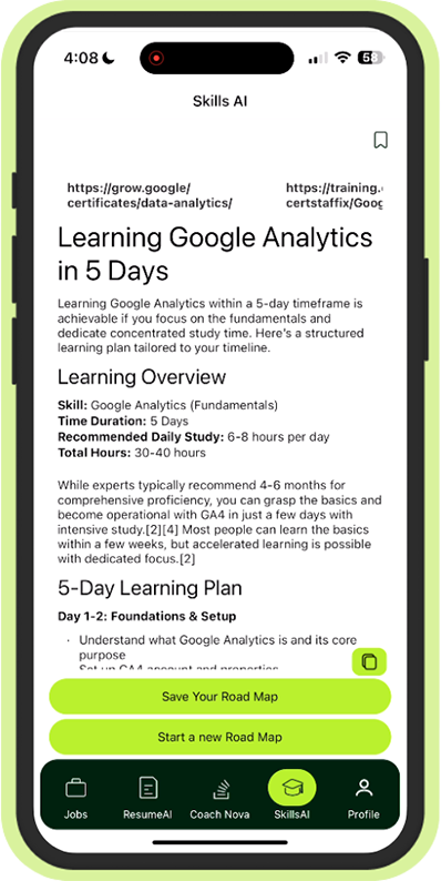 No worries! MyCareerPal’s Skill Gap feature shows which skills are in demand for your dream job and gives you learning suggestions to close the gap.